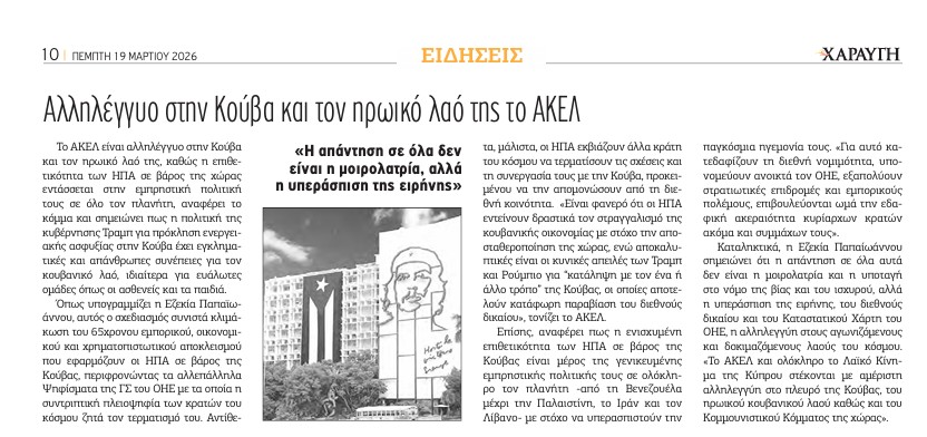 El AKEL se solidariza con Cuba y su heroico pueblo: La agresión de EE.UU contra Cuba forma parte de su política inflamatoria a escala mundial (18 de marzo de 2026, Oficina de Prensa del Comité Central del AKEL, Nicosia)