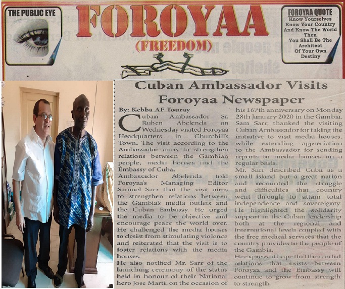 Banjul, 30 ene.- El diario Foroyaa publica hoy en su edición impresa, con llamado a portada, una visita realizada a su sede por el embajador de Cuba en Gambia, Rubén G. Abelenda, quien fue recibido por Samuel Sarr, editor gerente, y periodistas de ese medio de comunicación de esta nación del occidente africano.