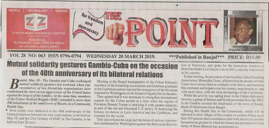 Los diarios gambianos Daily News y The Point publicaron hoy artículo sobre gestos solidarios mutuos entre Gambia y Cuba, en ocasión 40 aniversario de las relaciones entre ambas naciones hermanas.