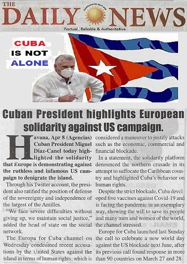 Banjul, 9 abr.- El diario gambiano Daily News destaca hoy el agradecimiento del presidente cubano, Miguel Díaz-Canel a las muestras solidarias recibidas desde Europa frente a otra despiadada e infame campaña que protagoniza EE.UU. hacia la mayor de las Antillas.