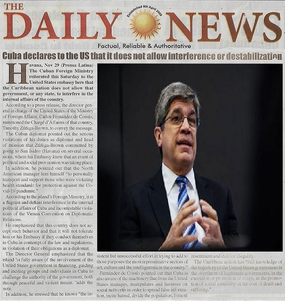 En su edición impresa y a media página, el referido cotidiano de esta nación del occidente africano informa que el director general de Estados Unidos del Ministerio de Relaciones Exteriores de la isla, Carlos Fernández de Cossío, convocó al Encargado de Negocios de la embajada de Washington en La Habana, Timothy Zúñiga-Brown, para transmitirle el mensaje.
