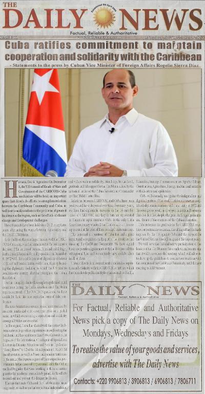 A página completa en su edición impresa, el citado cotidiano de este país del occidente africano, reproduce íntegramente las afirmaciones de Sierra Díaz sobre la cita de la Comunidad del Caribe y Cuba, la cual tiene como propósitos fortalecer las relaciones y buscar soluciones a los problemas de mayor incidencia en la región, como los efectos del cambio climático y los retos del desarrollo.