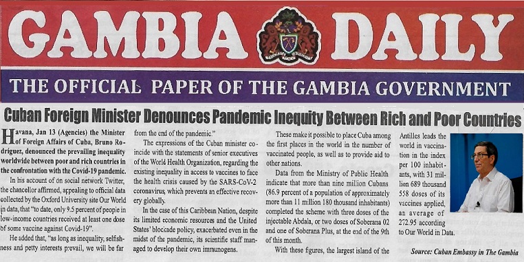 El Gambia Daily destaca que en el caso de la mayor de las Antillas, pese a sus limitados recursos económicos y el bloqueo que EEUU le ha arreciado en medio de la pandemia, sus científicos lograron desarrollar inmunógenos propios.