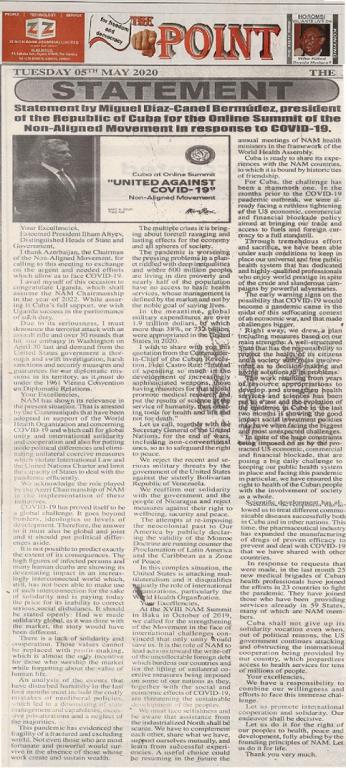 Banjul, 5 may.- El influyente periódico gambiano The Point publicó hoy íntegramente la intervención del presidente cubano, Miguel Díaz-Canel, en la Cumbre Virtual del Movimiento de Países No Alineados (MNOAL) “Unidos contra la Covid-19”, en la que llamó a globalizar la solidaridad, y reiteró la condena de su gobierno y pueblo al arreciado bloqueo que les impone Estados Unidos.