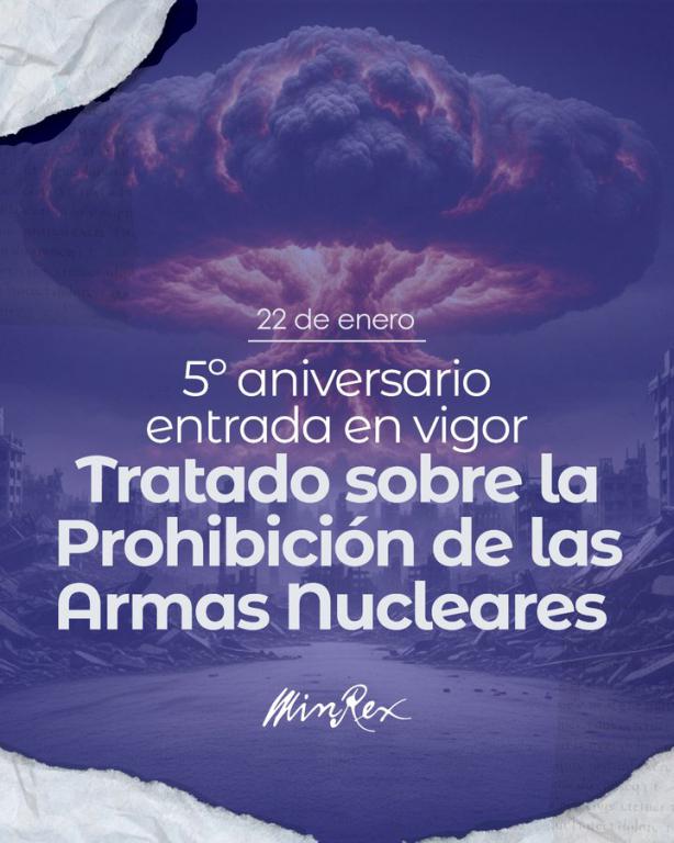 El ministro de Relaciones Exteriores de la República de Cuba, Bruno Rodríguez Parrilla, declaró en su cuenta de X, que a 5 años de la entrada en vigor del Tratado sobre Prohibición de Armas Nucleares (TPAN), la urgencia del desarme nuclear es incuestionable.