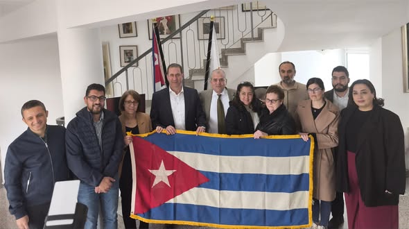 Nicosia, Chipre, 20 de marzo de 2026.- Una representativa delegación del secretariado y el Buró Político del Partido Progresista del Pueblo Trabajador (AKEL) e integrantes del movimiento popular de Chipre, acudió este viernes en la Embajada de la República de Cuba en esta capital, para ratificar su incondicional e inquebrantable apoyo a Cuba, a su pueblo y a su Partido Comunista, en las difíciles circunstancias que hoy vive la isla.