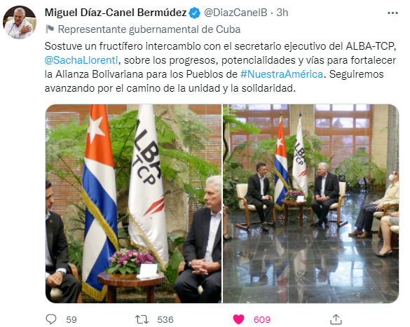 A comentar en Twiter un encuentro sostenido la víspera con el secretario ejecutivo de ese mecanismo de integración latinoamericano y caribeño, Sacha Llorenti, el mandatario cubano señaló que conversaron sobre los progresos, potencialidades y vías para fortalecer el ALBA-TCP.