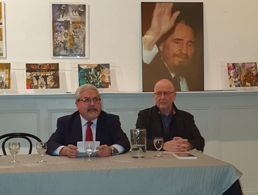 Por su parte, el Embajador cubano Manuel Aguilera de la Paz, resaltó la decisiva contribución de Fidel a la definitiva liberación de Cuba y la osadía de erigir un bastión de resistencia y rebeldía a solo 90 millas de la mayor potencia imperialista del mundo. Recordó sus dotes de estadista, su entrega a la defensa de las causas justas y su incansable lucha por un mundo mejor. Como ejemplo de ello, evocó el histórico discurso que el Comandante en Jefe pronunciara el 12 de junio de 1992 en la Conferencia de Naciones Unidas sobre Medio Ambiente y Desarrollo, en Río de Janeiro, el cual los presentes pudieron escuchar en la propia voz de Fidel por medio de un video que recoge la intervención.