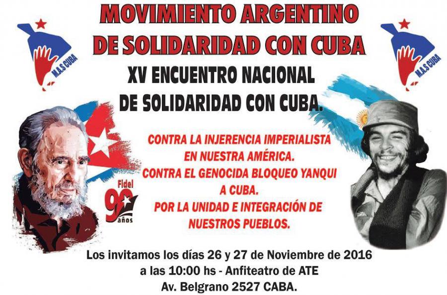 Los próximos días 26 y 27 de noviembre, los amigos de Cuba en Argentina se darán cita en la Ciudad de Buenos Aires para realizar el XV Encuentro Nacional de Solidaridad con Cuba. “Contra la injerencia Imperialista en Nuestra América, contra el genocida bloqueo yanqui a Cuba y por la Unidad e Integración de nuestros Pueblos”, será el lema central del evento. También estará dedicado a los 90 años del Comandante en Jefe Fidel Castro.