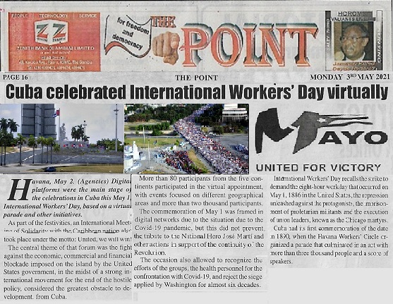 Banjul, 4 mayo. - El influyente diario gambiano The Point realza hoy en su edición impresa la celebración en Cuba de manera virtual del 1 de Mayo, y de un Encuentro Mundial de Solidaridad con la isla caribeña, en ocasión del Día Internacional de los Trabajadores.