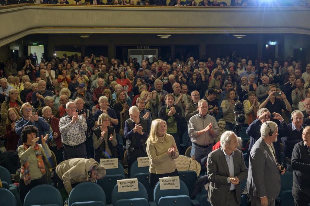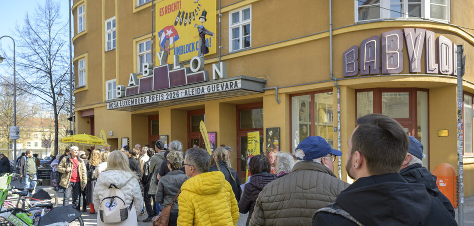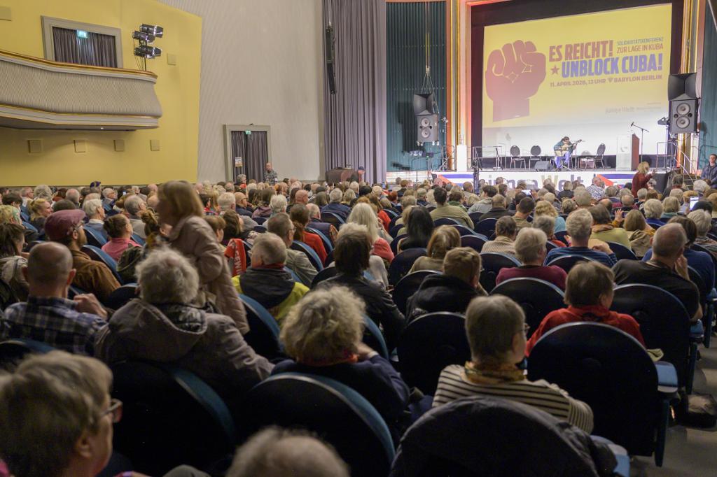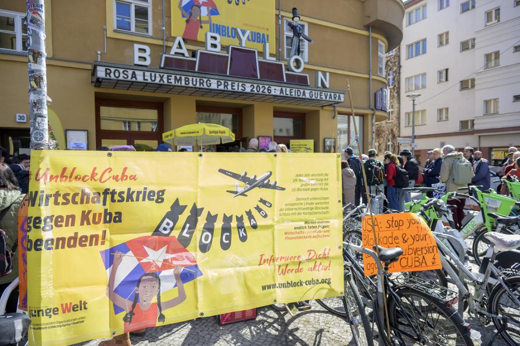 Berlín, 13 de abril de 2026.- Activistas de solidaridad con Cuba llegaron de todos los rincones de Alemania, y desde Austria y Suiza hasta Berlín para asistir a la Conferencia Internacional de Solidaridad con Cuba celebrada el pasado sábado, 11 de abril, en el cine Babylon. Más de 600 personas abarrotaron los dos pisos de la sala, todos querían mostrar su solidaridad con la Isla y homenajear a Aleida Guevara March, quien recibiría esa tarde el premio Rosa Luxemburgo, que otorga el diario alemán junge Welt y la revista cultural Melodie und Rhythmus y que distingue a la pediatra cubana por su amplia labor internacionalista. La hija del Guerrillero Heroico recibiría este premio también en nombre del pueblo cubano, al que se reconoce por su valentía y resistencia ante el imperialismo estadounidense.