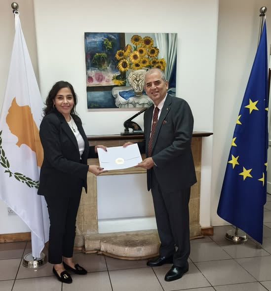 Nicosia, 20 de noviembre de 2025. La directora de Protocolo del Ministerio de Asuntos Exteriores de la República de Chipre, Helena Mina, recibió el pasado viernes 14 de noviembre al nuevo Embajador designado de la República de Cuba, Rubén Pino Martínez, quien presentó sus Copias de Estilo que le acreditan como Embajador de su país ante esa nación del Mediterráneo oriental.