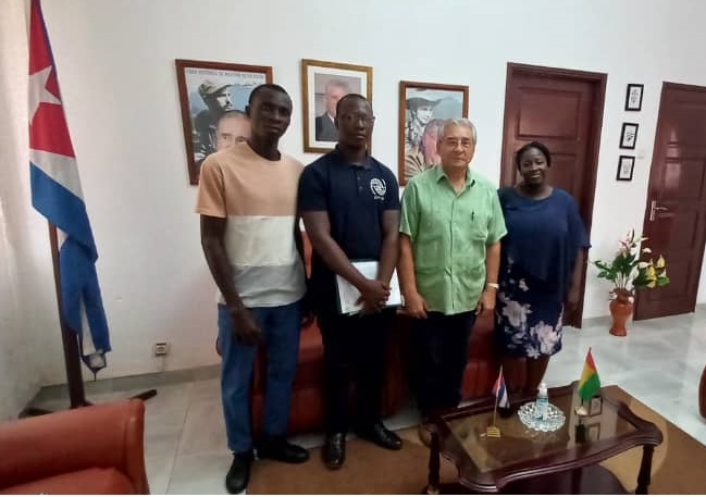El Embajador de Cuba en Guinea Bissau, Dr C. Raúl de la Peña Silva recibió a la Directiva del Consejo Nacional de los Hijos de los Combatientes de la Libertad de la Patria, presidida por el Lic. Domingo Tamba, quienes reiteraron el agradecimiento de sus padres y de ellos por el apoyo de la Isla para lograr la definitiva independencia del yugo colonial portugués el 24 de septiembre de 1973, cuyo 50 aniversario se celebrará en el presente año.