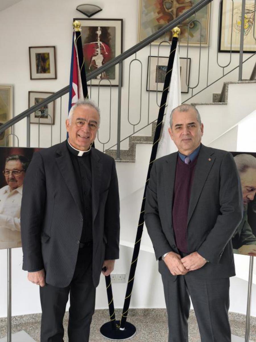Nicosia, Chipre. 22 de enero de 2026. El Embajador cubano en Chipre, Rubén Pino Martínez, recibió este jueves una visita de cortesía del Pastor Aristotelis Tsinoglou, representante nacional de la Iglesia Evangélica de Grecia en Chipre y Presidente de la ONG "Agape" (Amor).