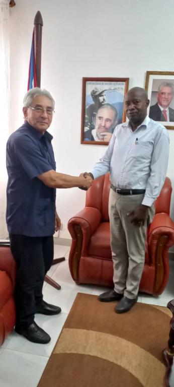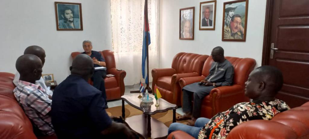 El Embajador de Cuba en Guinea Bissau, Dr C. Raúl de la Peña Silva recibió a los integrantes de la Dirección Ejecutiva de la Union Nacional de Trabajadores de Guinea Bissau (UNTG), presidida por su Secretario General, Sr. Laureano Pereira da Costa, los cuales agradecieron a Cuba por el apoyo a su país en la lucha por la independencia, alcanzada el 24 de septiembre de 1973, próximo a cumplir su 50 Aniversario, y por el papel que ha jugado a través de estos años en la formación y capacitación de los cuadros y profesionales para las diferentes ramas de la economía y la vida social del país