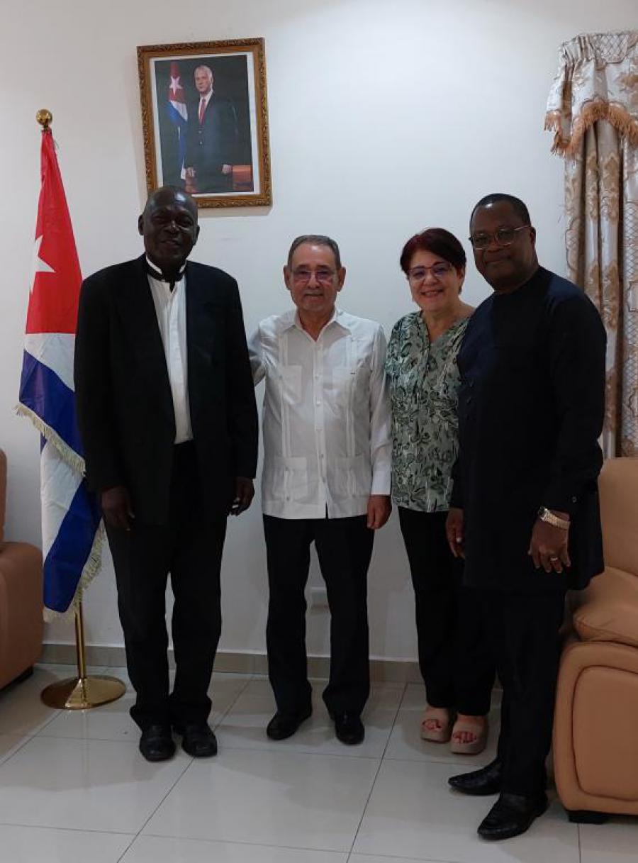 Cotonou, 22 de septiembre del 2023.- Ricardo García Napoles, embajador de Cuba en Benin recibió al alcalde de la Comuna de Dassa-Zoume, Sr.Djigbenoude Minakpon Óscar, médico de profesión egresado en Cuba de la primera graduación de profesionales benineses. El Dr. Oscar rememoró sus años como estudiante en la provincia de San Clara, actual Villa Clara y agradeció al gobierno cubano por su formación. Al respecto señaló, que como político de su país tratará de implementar en su comuna varias de las enseñanzas aprendidas en Cuba. El alcalde estuvo acompanado por el Dr. Sedegan, eminente intelectual politólogo benines. (CUBAMINREX/EMBACUBABENIN)