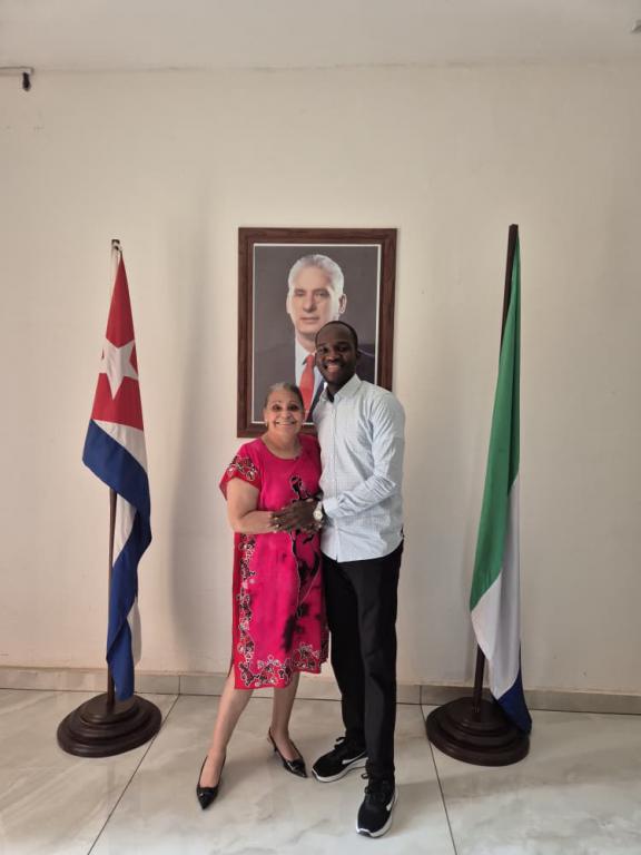 Freetown, 10 de abril de 2026.- La embajadora de la República de Cuba en Sierra Leona, Sra. Norma Sánchez Águila, recibió en la sede de la Misión Diplomática en Freetown, la visita del Cardiólogo sierraleonés graduado en Cuba, Dr. Albert Ina Charles.
