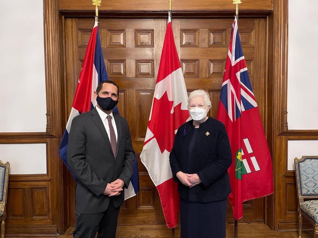Ottawa, 22 de febrero de 2022.- El cónsul general de Cuba en Toronto, Jorge Yanier Castellanos Orta y la cónsul Yoslaidy Clemente López, sostuvieron encuentros con la Honorable Elizabeth Dowdeswell, vicegobernadora de la provincia de Ontario y con el Honorable Ted Arnott, presidente de la Asamblea Legislativa de dicha provincia, en la sede de la Asamblea Legislativa de Ontario.