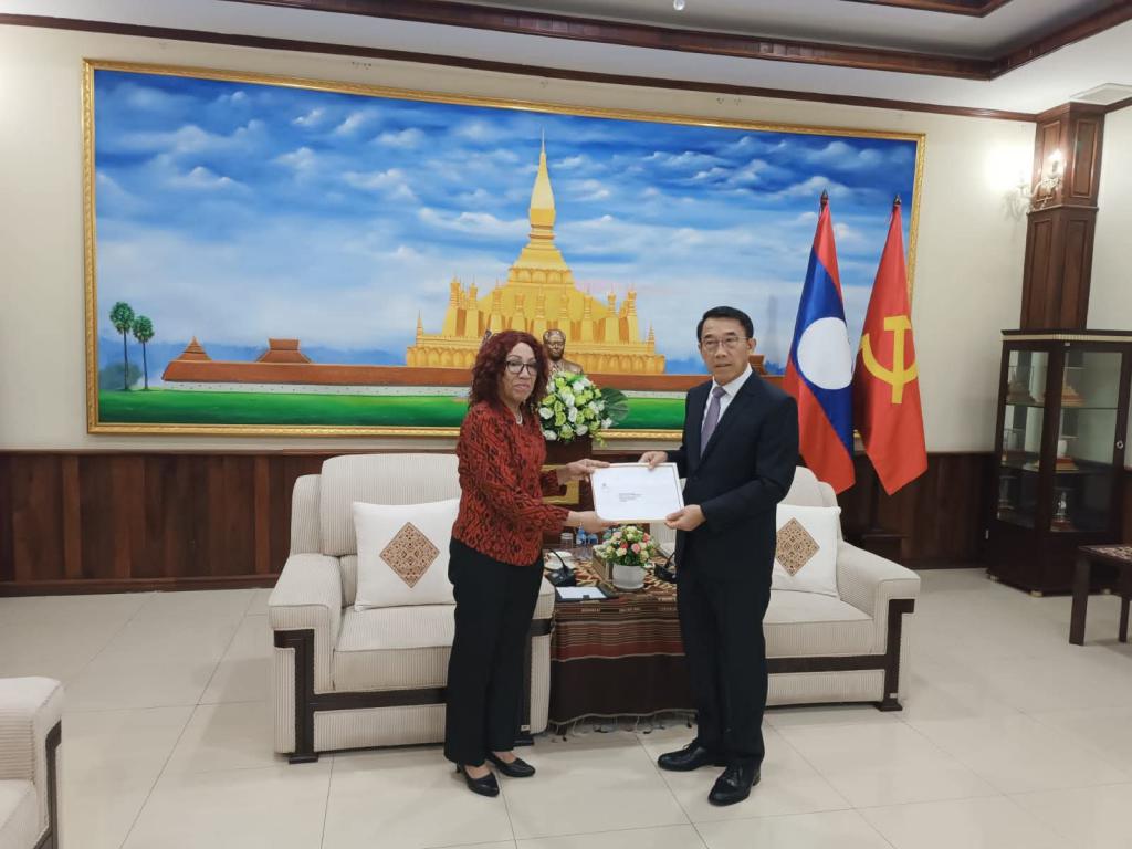 Vientiane 21 de enero de 2026. La Embajadora cubana Enna Viant, sostuvo un encuentro amistoso con el Cro. Bounleua Phandanouvong, miembro del Comite Central del Partido Popular Revolucionario Lao y Jefe de la Comision de Relaciones Exteriores de la organizacion politica.