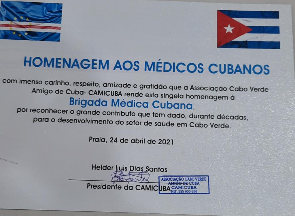 Praia, 24 de abril de 2021 La Asociación de Amistad de Antiguos estudiantes caboverdianos formados en Cuba (CAMICUBA) reconoció la labor desempeñada por la brigada médica cubana en este hermano país durante 45 años. Esta cooperación se ha mantenido de forma ininterrumpida en el área de la salud y se fortalece más cada día. En palabras del presidente de CAMICUBA, Ing. Helder Días Santos, el trabajo realizado cuenta con el agradecimiento del pueblo y de las autoridades caboverdianas por el alto sentido ético-humano que tienen los profesionales de la salud.