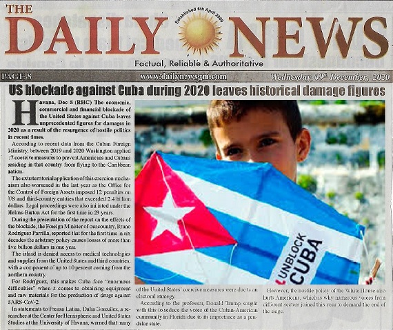 Banjul, 9 dic.- El bloqueo económico, comercial y financiero que EE.UU. arreció a Cuba durante 2020 le ha provocado daños sin precedentes a la mayor de Antillas, asegura hoy el diario gambiano Daily News.