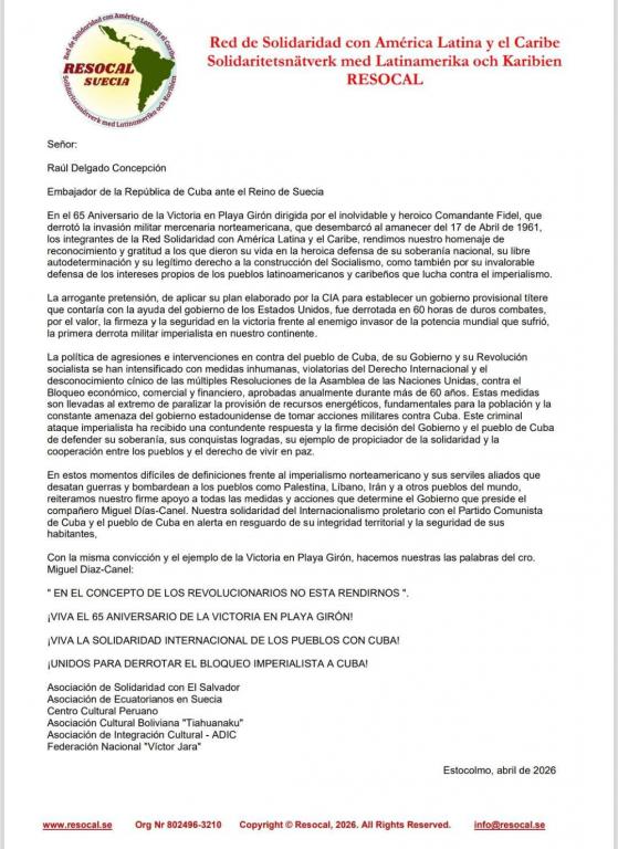 Red de Solidaridad con América Latina y el Caribe (RESOCAL) saluda el 65 aniversario de la Victoria de Playa Girón.