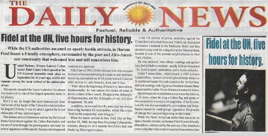 Con llamado a portada, el citado cotidiano de esta nación del occidente africano subraya en su edición impresa que la alocución de Fidel, el 26 de septiembre de 1961, ocupó durante casi cinco horas la atención de los presentes, una de las intervenciones más largas escenificadas en ese foro de la ONU.