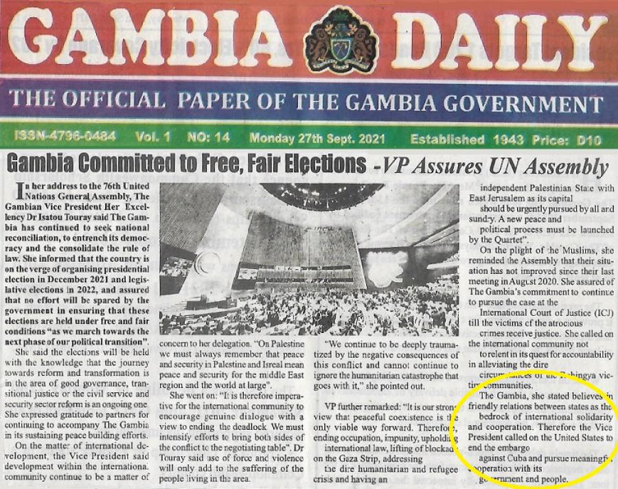 Por su parte, otro periódico, el Gambia Daily, destacó hoy el llamado hecho por la vicepresidenta de este estado africano, Isatou Touray, a EE.UU. a poner fin al bloqueo a Cuba, en su discurso ante el recién concluido segmento de alto nivel del 76 periodo de sesiones de la AGNU.