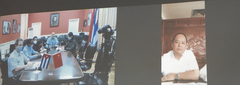 Beijing, 12 de mayo de 2020- El embajador de Cuba en China, Carlos Miguel Pereira Hernández, sostuvo en la mañana de hoy un fructífero intercambio por videoconferencia con el presidente de la empresa china Guangxi Fukang Medical Investment and Management Co. Ltd., Huang Liansheng.