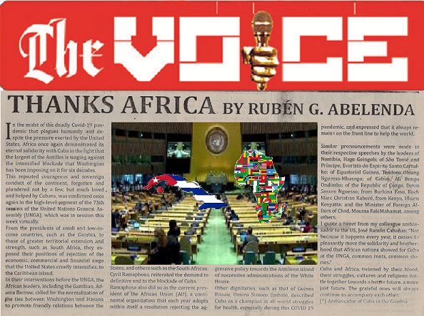 Bajo el título, Gracias África, la nota periodística escrita por el embajador de la isla caribeña en este Estado del occidente africano, Rubén G. Abelenda, resalta que la conducta valiente y soberana de los hermanos africanos se confirmó una vez más en el segmento de alto nivel del 75 periodo de sesiones de la Asamblea General de Naciones (AGNU), que sesionó la pasada semana de manera virtual.