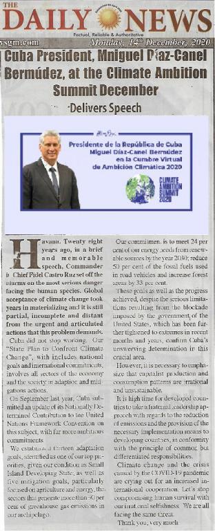 Banjul, 14 dic.- El diario gambiano Daily News reproduce hoy la intervención del presidente cubano, Miguel Díaz-Canel, en la “Cumbre virtual de Ambición Climática 2020”, en la cual subrayó que el calentamiento global y la crisis provocada por la COVID-19 nos están pidiendo a gritos fomentar la cooperación internacional.