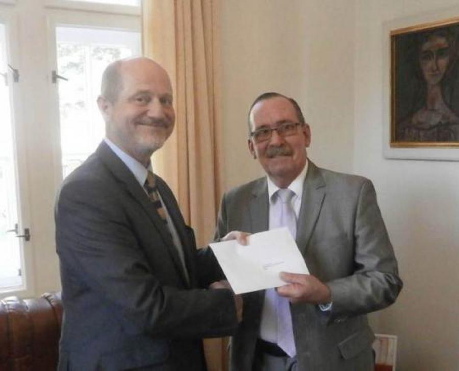 REPÚBLICA CHECA, 26 de octubre de 2017.- El Director de América de la Cancillería checa, Vit Korselt, hizo entrega oficial de la donación de 100 000.00 USD en nombre del gobierno de la República Checa al Encargado de Negocios de Cuba, Embajador Félix León Carballo, como ayuda para resarcir los daños ocasionados recientemente por el huracán Irma a la mayor de las Antillas.