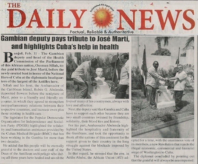 Ambos cotidianos se hicieron eco del homenaje de Sillah, quien depositó flores junto al embajador cubano, Rubén G. Abelenda, en el busto a Martí, erigido el pasado 28 de enero en la sede de la misión diplomática de la mayor de las Antillas en esta nación de África occidental.