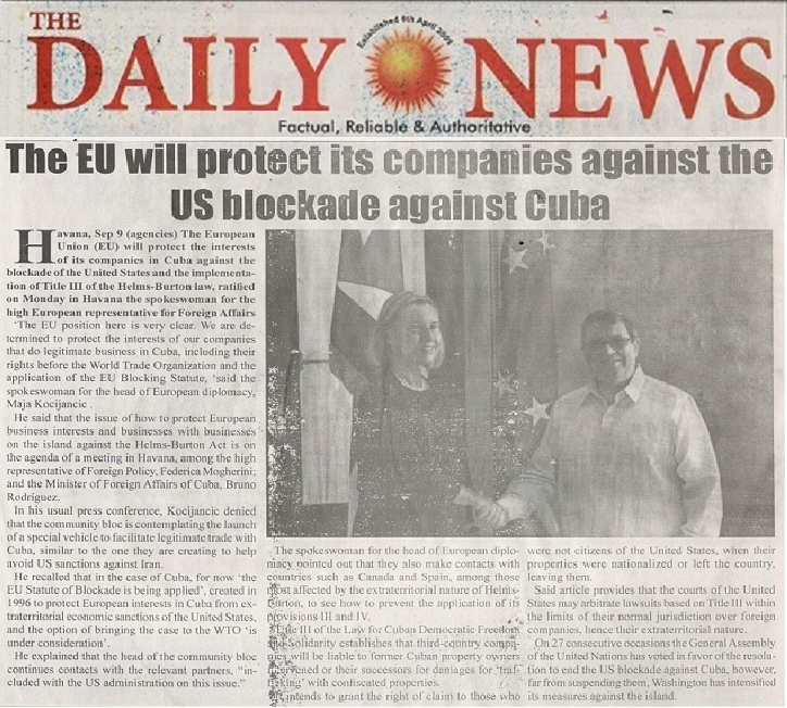 El diario gambiano Daily News publicó a página completa, este 11 de septiembre, dos notas sobre las coincidencias de posiciones entre la Unión Europea (UE) y Cuba contra el prolongado y arreciado bloqueo que EEUU impone a la mayor de las Antillas.
