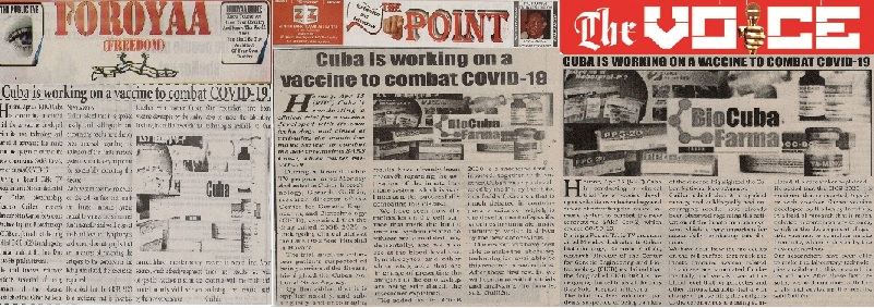 Banjul, 16 abril. – Tres periódicos gambianos, The Point, TheVoice y Foroyaa, resaltan hoy en sus páginas impresas los esfuerzos que realizan los científicos cubanos en busca de una vacuna contra el coronavirus SARS Cov-2, causante de la pandemia Covid-19 que mantiene en vilo a la humanidad.