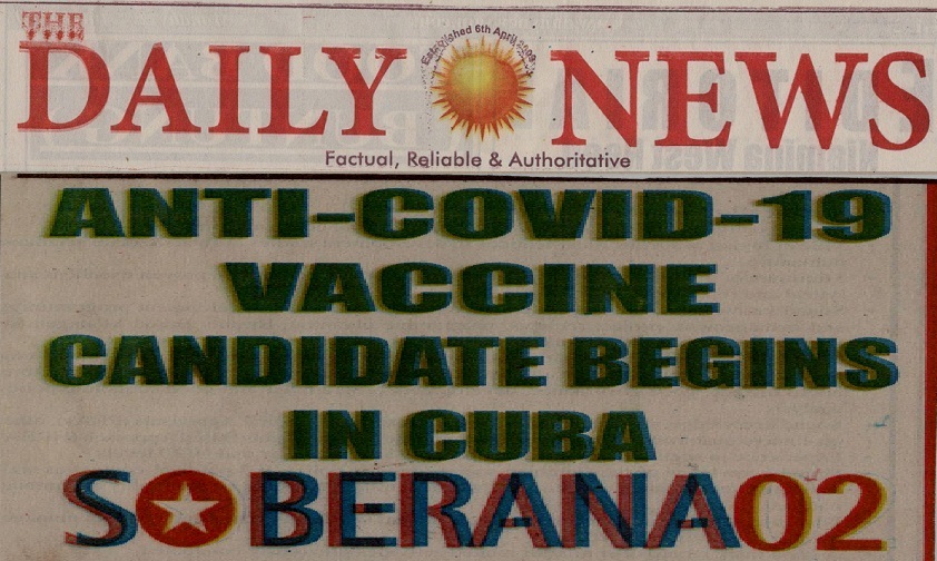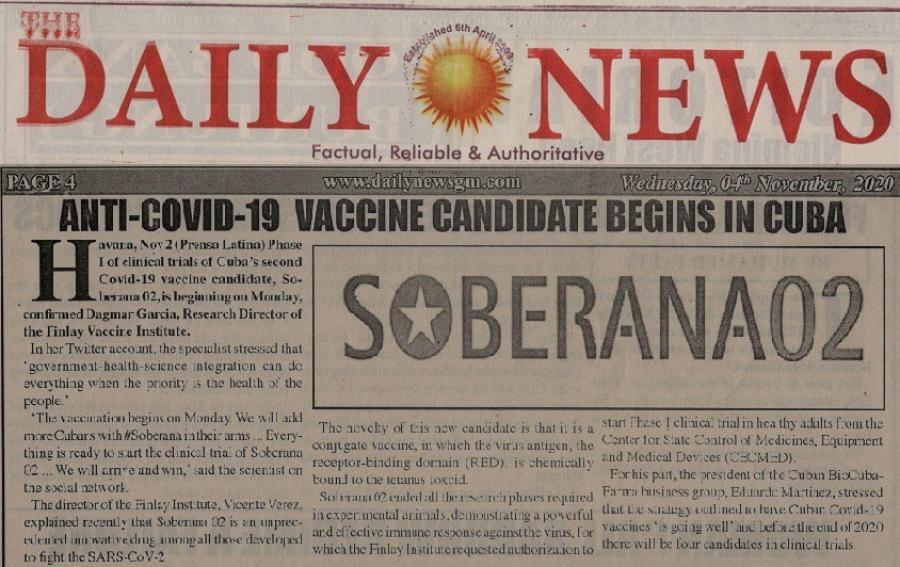 Banjul, 4 nov.- Con destaque en su portada, el diario gambiano Daily News informó hoy del inicio de los ensayos clínicos del segundo candidato vacunal cubano contra la Covid-19 “Soberana 02”.