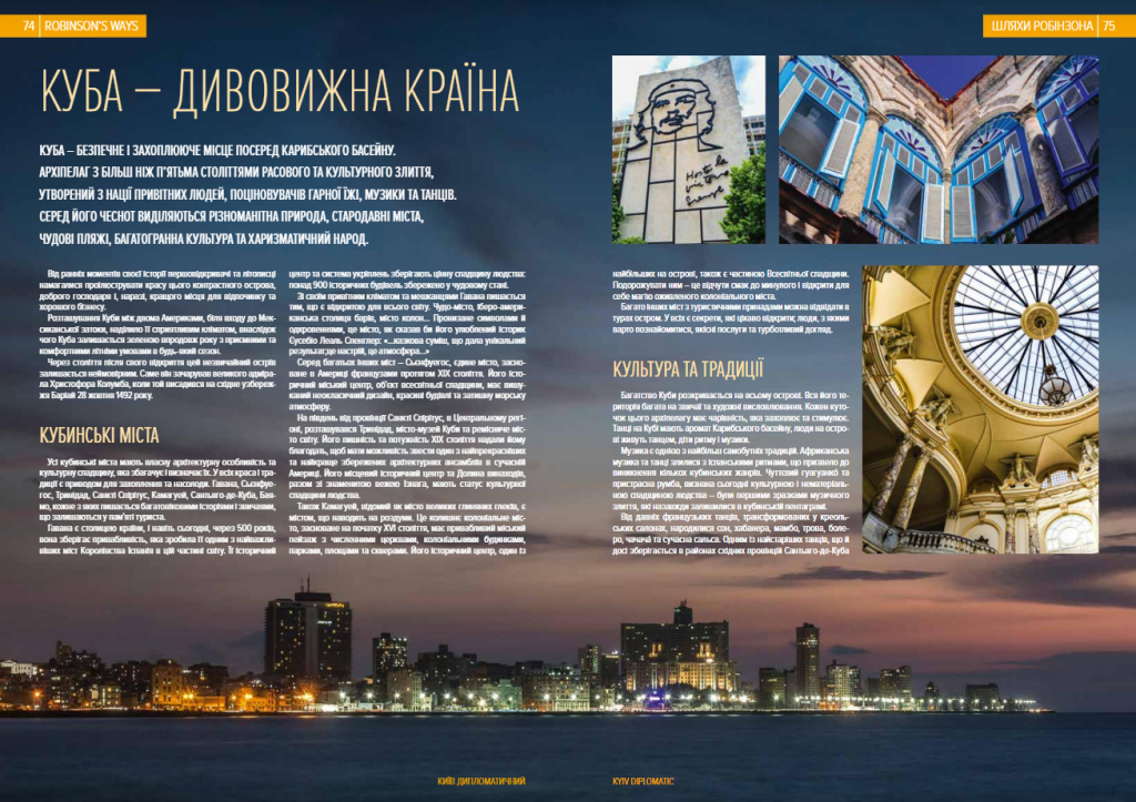 Kiev, 29 de octubre de 2020 – La revista “Kyiv Diplomatic” publicó en su edición número 10 del 2020 un artículo sobre la riqueza natural, y cultural de Cuba. Asimismo, se habla del desarrollo del turismo en la isla, especialmente en el actual contexto epidemiológico.