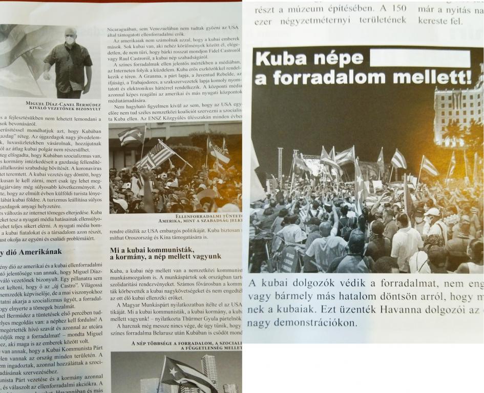 Durante los meses de julio y el período de agosto, la revista “Victoria” publicación del Partido Obrero Húngaro publicó cuatro números con amplios artículos sobre la realidad cubana hoy en día y el resultado del encuentro informativo que organizó la embajadora en la Misión donde explicó todas las maniobras políticas mediáticas del imperio para tratar de demostrar al mundo que Cuba es un país fallido. Con estas publicaciones expresando la verdad, el Partido Obrero hace una gran contribución y apoyo a la Revolución cubana dado que sus publicaciones en idioma húngaro van directamente a su pueblo.
