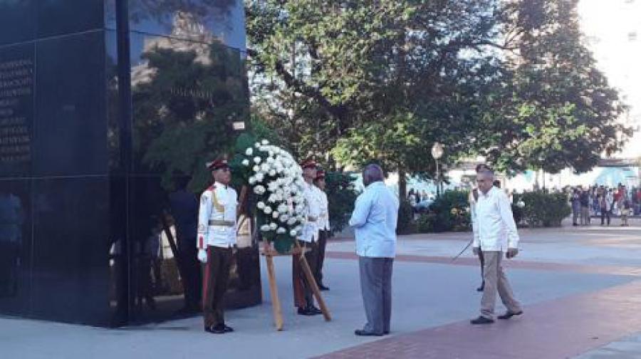 La Habana, 20 de diciembre de 2022.- Con motivo de su visita oficial a Cuba, Philip Davis, primer ministro de la Mancomunidad de Bahamas, rindió tributo este martes a José Martí, Apóstol de la independencia nacional con una ofrenda floral frente a la estatua ecuestre que evoca su figura en el Parque 13 de marzo, de esta capital.