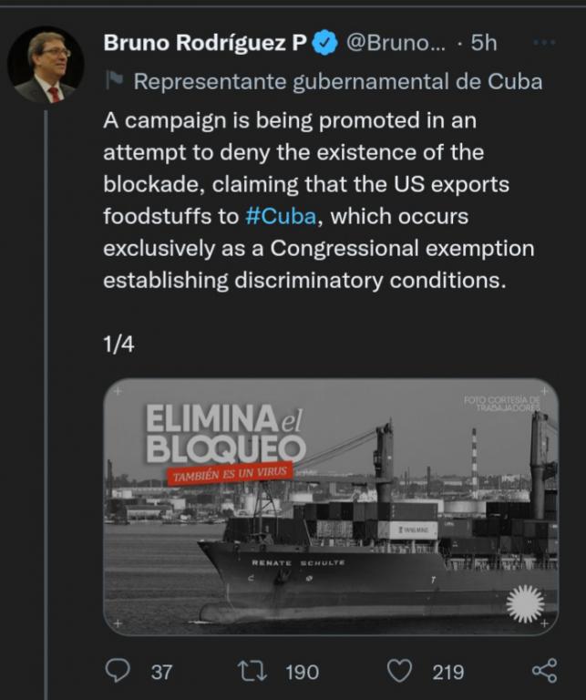 El canciller cubano, Bruno Rodríguez, denunció este viernes la campaña que pretende negar la existencia del bloqueo de Estados Unidos con el pretexto de las exportaciones de alimentos desde la nación norteña hacia el territorio caribeño. De acuerdo con el ministro de Relaciones Exteriores, este intercambio ocurre exclusivamente bajo una excepción aprobada por el Congreso norteamericano con condiciones discriminatorias. Se trata únicamente de ventas unidireccionales de Estados Unidos a Cuba, sin posibilidad de crédito, mediante la obligatoriedad de pago anticipado y en efectivo, y bajo licencias aprobadas por el Departamento del Tesoro, todo incompatible con las prácticas del comercio internacional, escribió en Twitter. Por mandato legal, el Gobierno norteamericano está obligado a perseguir e interferir en las transacciones comerciales de Cuba en cualquier país del mundo, obstaculizar las necesarias gestiones financieras y sabotear el transporte marítimo, agregó. El canciller denunció las amenazas y represalias de Washington contra las empresas de cualquier país que comercien con La Habana. “Se trata de un cerco económico férreo y abrumador. Quien lo niegue está faltando a la verdad”, subrayó Rodríguez. (Con información de Prensa Latina)