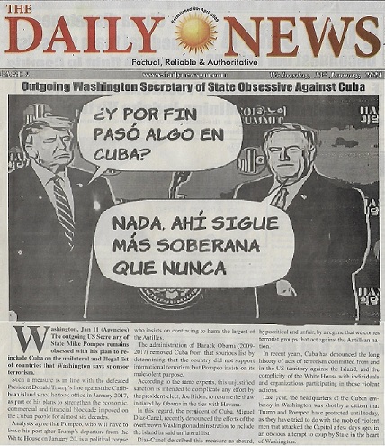 Banjul, 13 ene.- El saliente secretario de Estado de EE.UU., Mike Pompeo, está obsesionado con Cuba y continúa empeñado en hacerle daño a la mayor de las Antillas, subraya hoy el diario gambiano Daily News.
