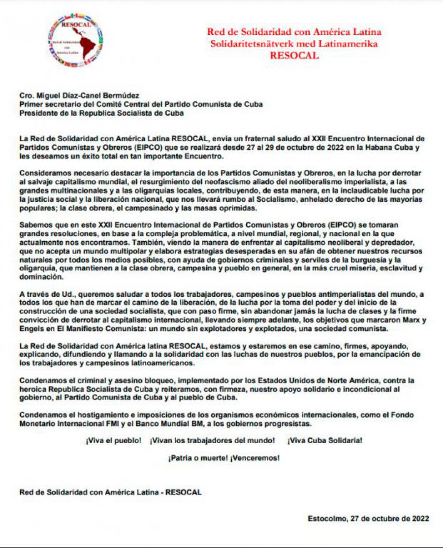 La Red de Solidaridad con América Latina RESOCAL, envía un fraternal saludo al XXII Encuentro Internacional de Partidos Comunistas y Obreros (EIPCO) que se realizará desde 27 al 29 de octubre de 2022 en la Habana Cuba y les deseamos un éxito total en tan importante Encuentro. Consideramos necesario destacar la importancia de los Partidos Comunistas y Obreros, en la lucha por derrotar al salvaje capitalismo mundial, el resurgimiento del neofascismo aliado del neoliberalismo imperialista, a las grandes multinacionales y a las oligarquías locales, contribuyendo, de esta manera, en la inclaudicable lucha por la justicia social y la liberación nacional, que nos llevará rumbo al Socialismo, anhelado derecho de las mayorías populares; la clase obrera, el campesinado y las masas oprimidas. Sabemos que en este XXII Encuentro Internacional de Partidos Comunistas y Obreros (EIPCO) se tomaran grandes resoluciones, en base a la compleja problemática, a nivel mundial, regional, y nacional en la que actualmente nos encontramos.