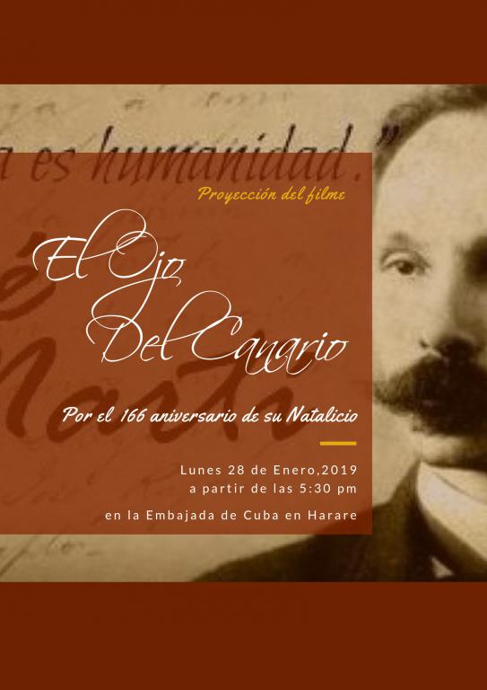 Este lunes 28 de enero se proyectó en la Embajada de Cuba en Zimbabwe la película José Martí: El Ojo del Canario, del director cubano Fernando Pérez, por el cumplimiento del 166 aniversario del nacimiento del Héroe Nacional de Cuba, nuestro José Martí. La Embajada cubana no dejó pasar por alto un día tan importante para todos los cubanos y convocó a la comunidad cubana en Harare, colaboradores de la Misión Médica y miembros de la solidaridad. Todos juntos honrando al Maestro y ratificando nuestro apoyo a la Constitución, nuestro antiimperialismo y por al unidad latinoamericana y la no injerencia yanqui, algo que Martí supo predecir hace casi 2 siglos atrás.