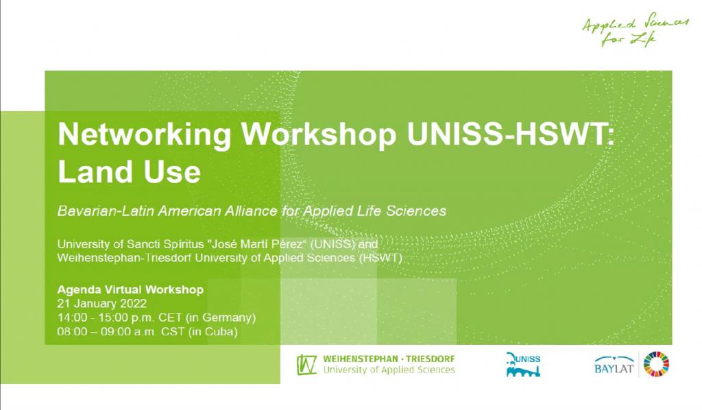 Berlin, 21 enero 2022. En la tarde de este viernes 21 de enero, horas de la mañana en Cuba, tuvo lugar un taller virtual entre la Universidad de Sancti Spíritus “José Martí Pérez” (UNISS) y la Universidad de Ciencias Aplicadas Weihenstephan-Triesdorf (HSWT) con la participación de profesores y científicos de ambas instituciones. Además, estuvieron presentes en el encuentro la encargada de negocios de la Embajada de Cuba Ivet López y la directora ejecutiva del Centro Universitario de Baviera para América Latina (BAYLAT) Dr. Irma de Melo-Reiners.