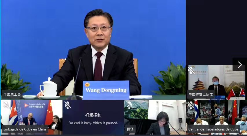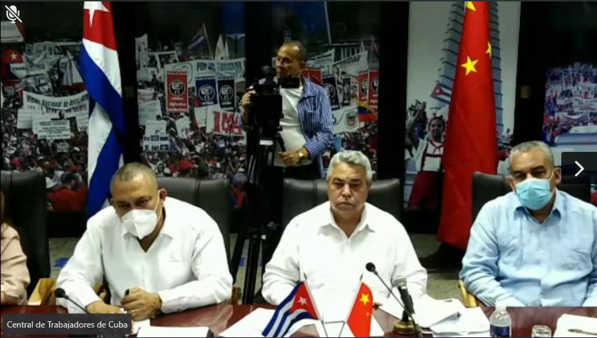Beijing, 30 de marzo de 2022- El miembro del Buró Político del Comité Central del Partido Comunista de Cuba y secretario general de la Central de Trabajadores, Ulises Guillarte de Nacimiento, sostuvo un intercambio por videoconferencia con el vicepresidente del Comité Permanente de la Asamblea Popular Nacional de China y presidente de la Federación de Sindicatos de Toda China, Wang Dongming. Participaron además en el encuentro, los Embajadores acreditados en ambos países, Carlos Miguel Pereira Hernández y Ma Hui.