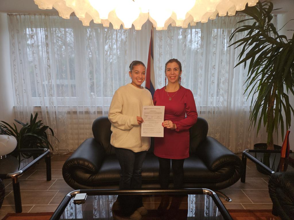La Jefa de la Oficina Diplomática de Cuba en Bonn, Mónica Rodríguez Sánchez, hizo entrega de la boleta de asignación de carrera a la estudiante Mónica Pilar Bosch, quien fue seleccionada para cursar estudios de Medicina en Cuba como parte de este programa, que no solo contribuye en el fortalecimiento de los vínculos entre Cuba y sus nacionales en el exterior, sino también favorece la formación humanista y solidaria más integral de los ciudadanos cubanos y sus hijos.