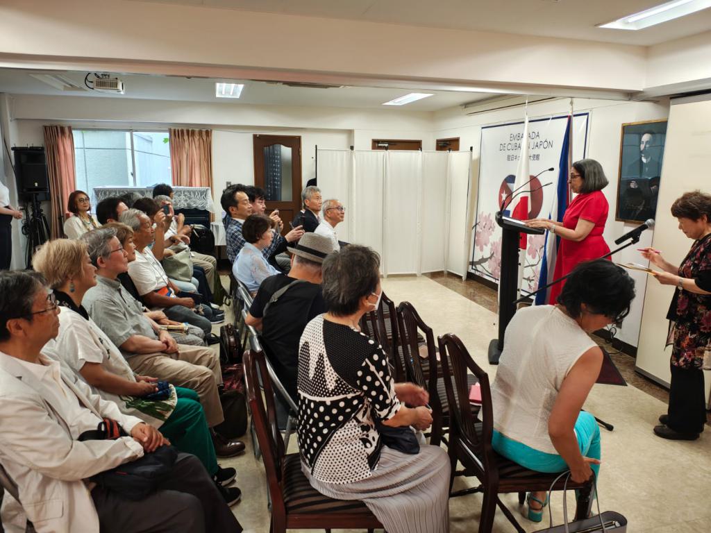 Tokio, 18 de julio. La Embajada de Cuba en Japón acogió la celebración del lanzamiento de la segunda edición del libro 50 Capítulos sobre Cuba, compendiado por la profesora japonesa Masako Goto. La actividad fue organizada por la Misión, de conjunto con la Asociación Japonesa de América Latina y el Caribe (AJALAC) y la editorial Akashi Shoten.