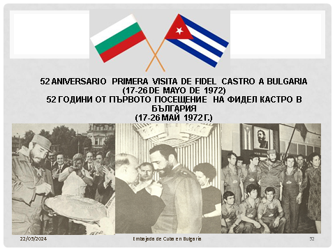 Sofía, 23 de mayo de 2024. En el marco de la jornada de promoción de oportunidades de negocios con Cuba, se recordó que en esta fecha, del 17 al 26 de mayo, hace 52 años se realizó la primera visita del Comandante en Jefe Fidel Castro Ruz a Bulgaria.