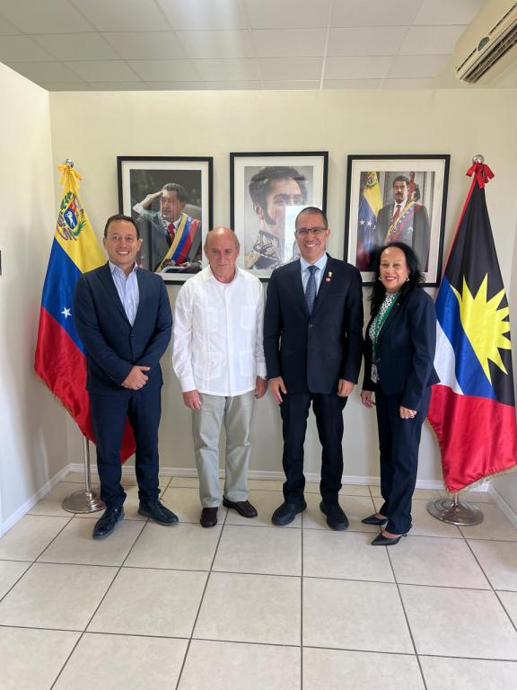 En la mañana de hoy el embajador de Cuba en Antigua y Barbuda Sergio Martínez Gonzáles sostuvo un encuentro en la sede de la Embajada de Venezuela en la isla caribeña con el Secretario General del ALBA - TCP Jorge Arreaza quien acompañado del Vice Canciller Venezolano para el Caribe Raúl Li realizan una breve visita de trabajo a Antigua y Barbuda. Durante el intercambio sostenido se abordó los vínculos del ALBA-TCP con la región del caribe y las posibilidades de fortalecer los actuales vínculos existentes entre este bloque regional y los pequeños estados insulares caribeños, asi como los roles de Cuba y Venezuela en función de este objetivo. En el encuentro también estuvo presente la Embajadora de Venezuela en Antigua y Barbuda Carmen Luisa Velazques.