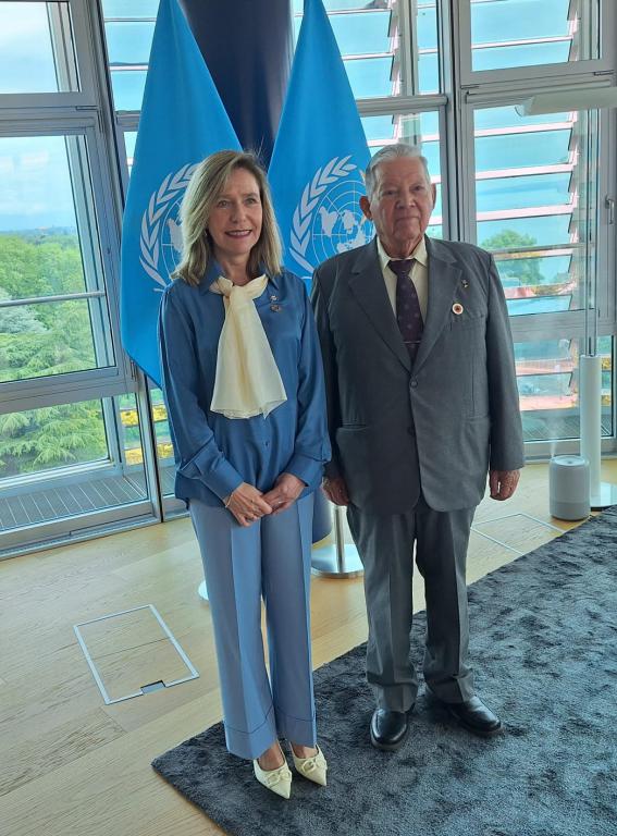 Ginebra, Suiza, 3 de junio de 2025. Como parte del intenso programa de trabajo que cumple el General Ramón Pardo Guerra y la delegación que lo acompaña durante la 8va Plataforma Global para la Reducción del Riesgo de Desastres, sostuvieron un encuentro con la Sra. Celeste Saulo, Secretaria General de la Organización Meteorológica Mundial (OMM).